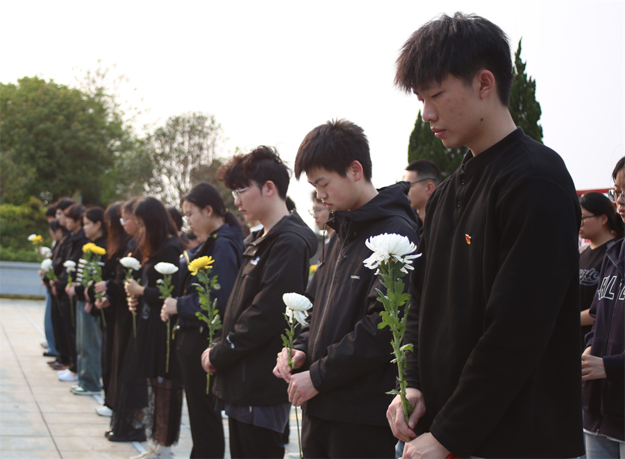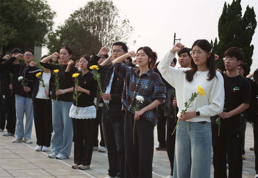 随后,团员代表魏双源带领全体团员重温入团誓词,党员代表温雅晴带领学生党员重温入党誓词。铿锵誓言回荡陵园,彰显出新时代党团员坚定信仰、接续奋斗的青春决心。仪式最后,全体师生绕行纪念碑一周,依次献上鲜花,以朴素行动寄托哀思与追忆。
