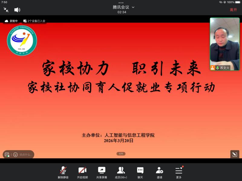 为深入推进家校协同育人工作、进一步凝聚育人合力,3月20日我院通过腾讯会议召开“家校社协同育人促就业专项行动”线上会议。院党委书记胡红武、副院长苏文火、保卫处副处长李伟、我院老师毛桑隐、校企合作负责人喻军、全体毕业班班主任、2026届毕业生及家长参加会议。会议内容包括学院就业形势分析、基层项目介绍、企业岗位分享、参军入伍政策解读以及在线问答五个议程。