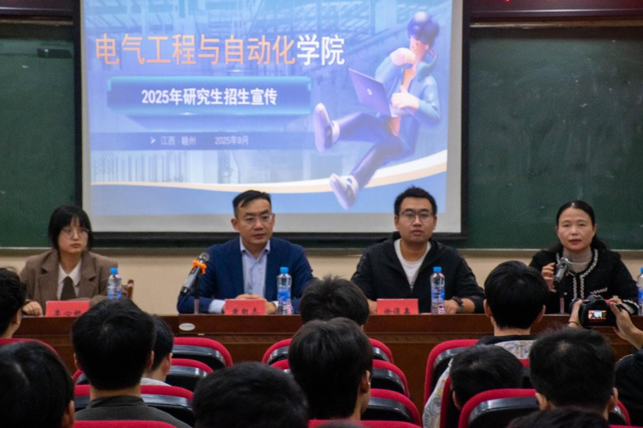 本站讯(学生记者:李宸誉 唐诗瑶 责任编辑:温雅晴)为帮助学生明晰就业方向、把握升学机遇。10月22日下午,我院于理工楼S314召开硕士研究生招生宣讲会。江西理工大学电气工程学院副院长黄朝志,教师李心妍、徐俊鑫及智能制造与材料化工学院党委书记龙玲及我院22级、23级部分学生共同参加,大会由黄朝志主讲。