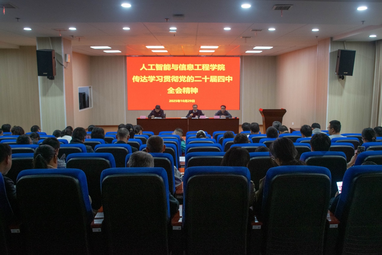 本站讯(学生记者:李宸誉 责任编辑:温雅晴)11月5日下午,人工智能与信息工程学院在实训楼E408召开党员大会,传达并学习贯彻党的二十届四中全会精神。院党委书记胡红武主持会议,全体党员参会。
