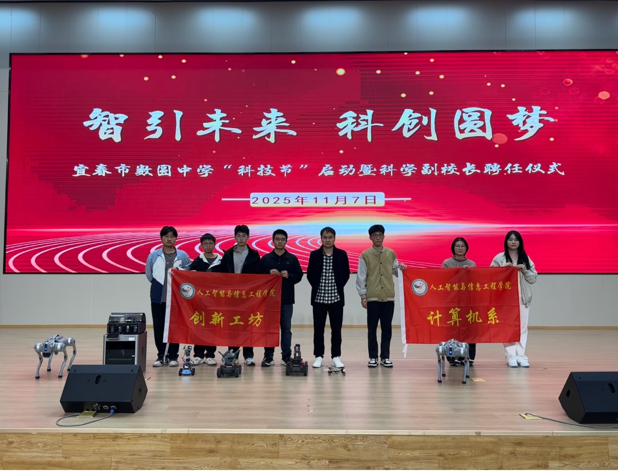 本站讯(院办供稿)2025年11月7日,宜春市数圆中学“科技节”启动暨科学副校长聘任仪式隆重举行,我院深度参与此次活动,助力校际科教协同育人迈出新步伐。仪式上,数圆中学党支部书记、校长尚琼为我院张副院长颁发科学副校长聘书,标志着我院与数圆中学在科学教育领域的深度合作正式开启。作为人工智能领域专业力量的代表,张副院长随后为师生带来题为“人工智能与机器人融合发展”的科普讲座,以渊博学识与生动案例解析AI技术原理、应用场景及未来趋势,并结合机器人深度学习、计算机视觉等技术演示,激发学生对科技的探索热情。