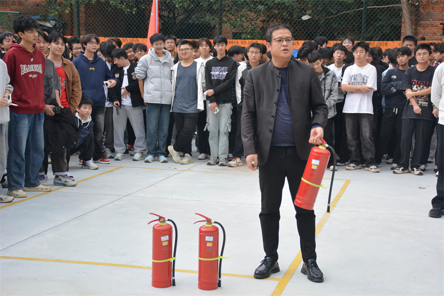 在安全集合点,学校保卫处消防科彭炜老师给大家讲解了消防应急的相关知识,现场演示了如何正确、规范地使用灭火器等消防器材。他进一步强调,“安全无小事”,防患于未‘燃’”,全体同学要以此次演练为契机,绷紧安全弦,将消防安全知识内化于心、外化于行,通过演练强化应急技能,携手共筑校园的安全防线。
