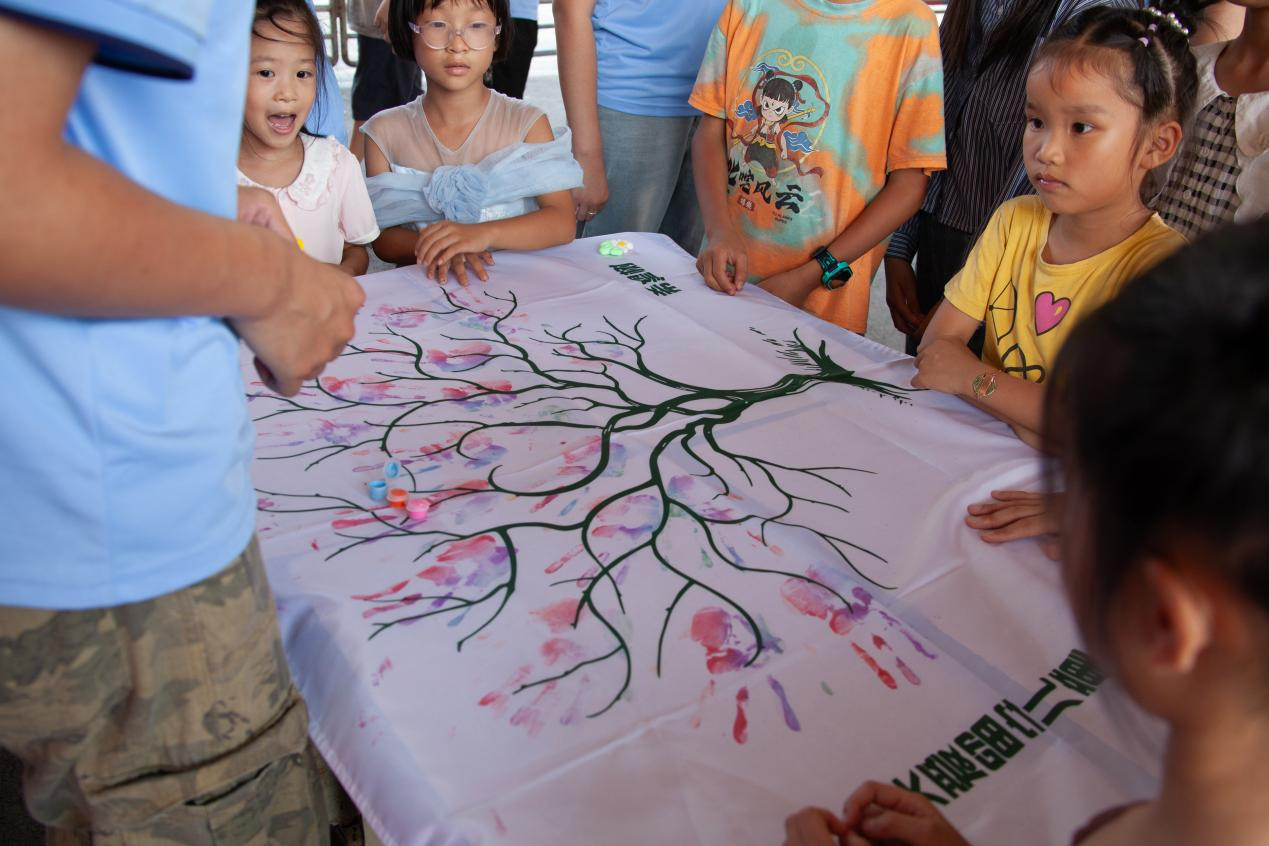 活动尾声的指印绘树环节将气氛推向高潮。队员们提前铺设好印有巨大树干的画布。孩子们蘸取缤纷颜料,用手指在“树枝”上轻轻点缀,一朵朵绚丽的“花朵”瞬间绽放。随着越来越多的小手印下,原本光秃的“大树”变得枝繁叶茂、花团锦簇。每一个小小的指印,都承载着孩子们的童真梦想和对美好未来的期盼。大家共同完成的这幅“希望之树”,成为活动现场最温暖的记忆。