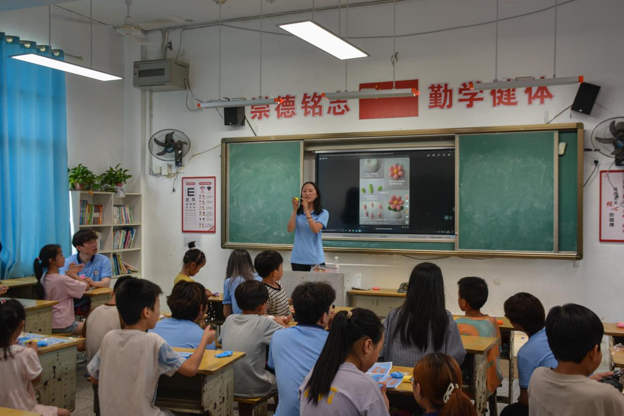 手工粘土制作的现场同样充满欢声笑语。柔软的彩泥在孩子们手中揉捏塑形,变成一个个生动的人物、可爱的花朵和充满创意的小摆件。队员们与孩子们并肩而坐,共同构思、协作制作,在互动交流中激发创意灵感,培养动手能力和合作精神。