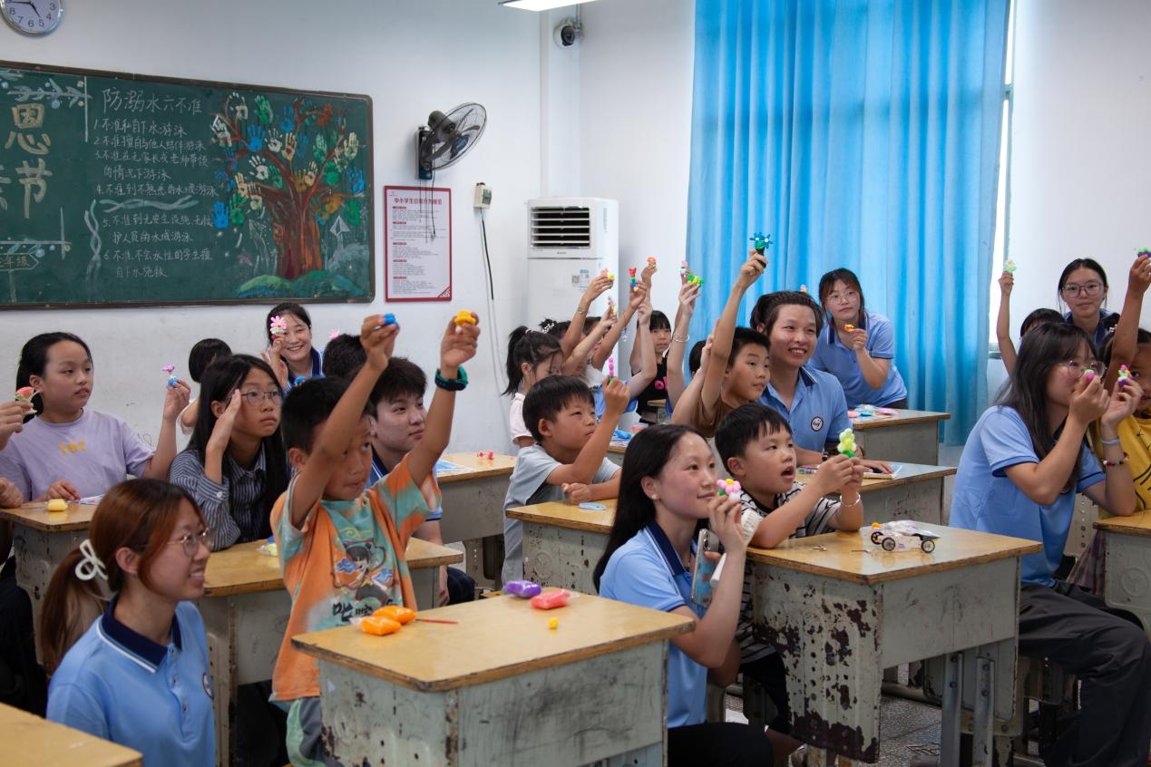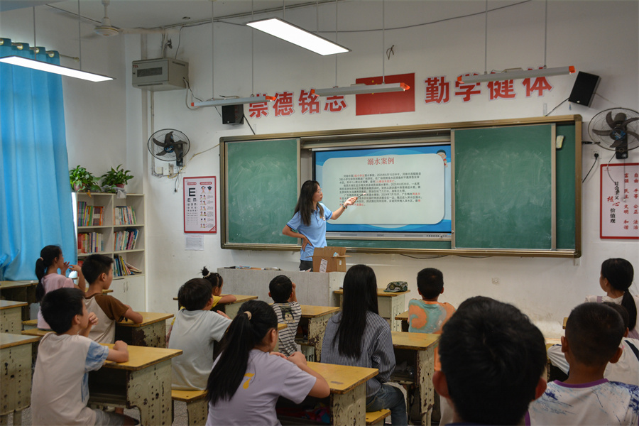 卢德铭小学的教室里,队员们为孩子们打造了一场防溺水“沉浸式课堂”。动画短片里,危险场景直观上演;憋气小游戏中,溺水窒息感真实可触;“击鼓传花”问答间,安全知识悄然入脑。孩子们跟着学跳防溺水儿歌手势舞,轻快旋律里,“六不准”化作灵动舞姿。当防溺水知识通过生动形式融入课堂,安全已不再是生硬的规则——这是用趣味与互动编织的生命防护网,让自我保护的意识在欢笑声中浸润童心,让“守护生命”的种子在乡村校园破土发芽。