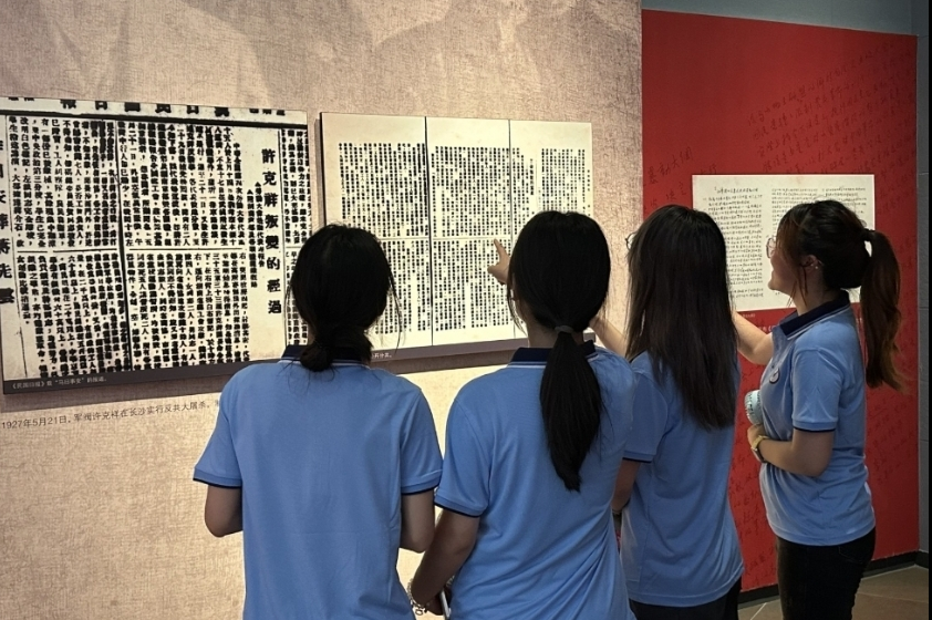 秋收起义红色教育基地内,泛黄的战地照片、斑驳的革命文物静静陈列,无声诉说着秋收起义时期当地群众支援红军的壮烈史实。实践队成员在此聆听“半截皮带”“一盏马灯”等革命故事,透过历史细节感悟先烈坚守信念的精神密码。老党员的党徽虽已磨损,可他们讲述的革命往事却依旧鲜活。“跟党走,日子才有奔头”的朴实话语,让红色基因在面对面交流中实现“代际传递”。鲜红的党旗下,重温入党誓词的铿锵声回荡展厅,成为青年学子赓续红色血脉的生动注脚。