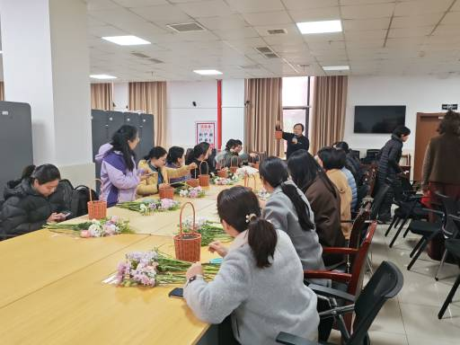 在实践操作环节,女教职工们在花艺老师的全程指导下,细致修剪,将一朵朵鲜花错落搭配、匠心插制,把普通的花材转化为层次丰富、意境优美的花艺作品。现场花香四溢、欢声笑语不断,尽显巾帼风采与生活热情。