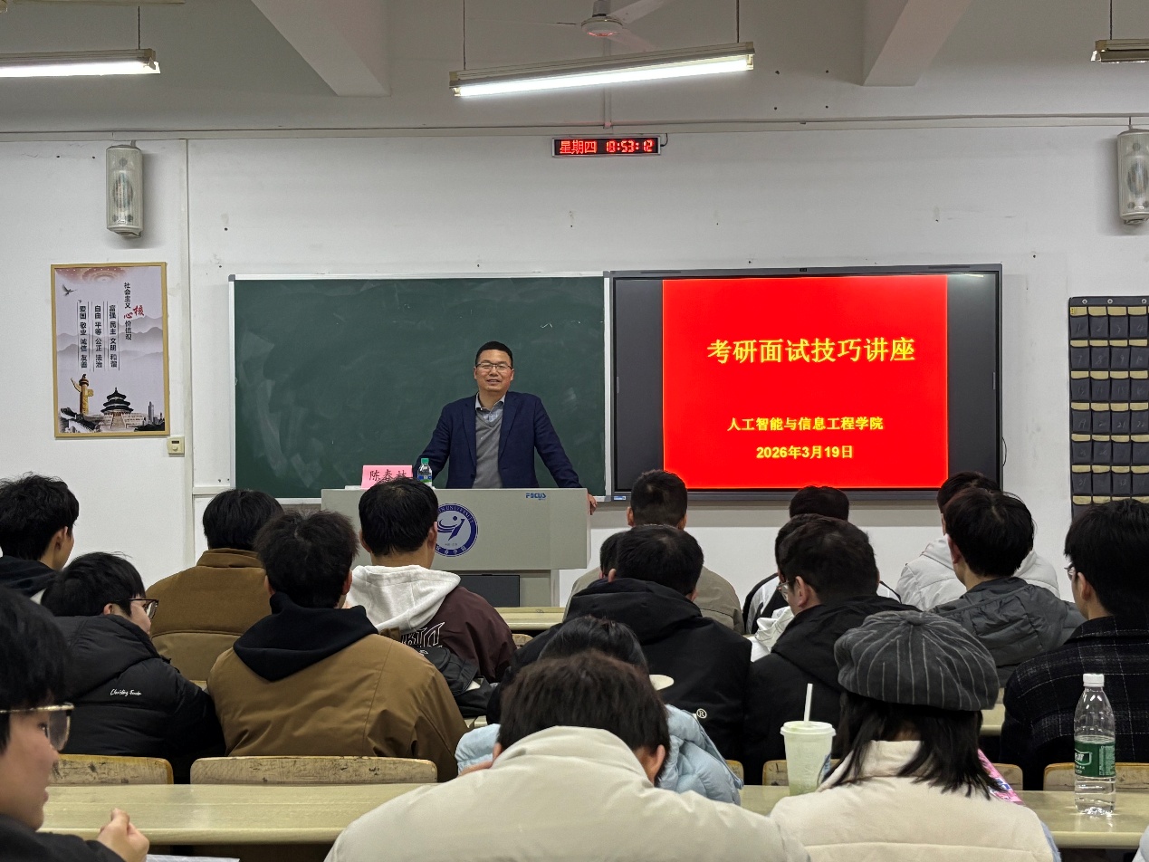本站讯(学生记者:谢思琪 徐祺炜 程烜申 责任编辑:王磊)为充分发挥党建引领作用,切实做好考研学子升学帮扶工作,助力上线学子冲刺复试、成功上岸,3月19日晚,人工智能与信息工程学院组织开展考研复试技巧讲座暨模拟面试活动。学院邀请研究生工作处陈春林副处长主讲讲座,院长臧爱彬、骨干教师冷春勇、黄伟凡、丁德武、廖建庆、方光伟、王玮,同时邀请外国语学院教师组成指导团队,全体考研上线学生参与本次活动。